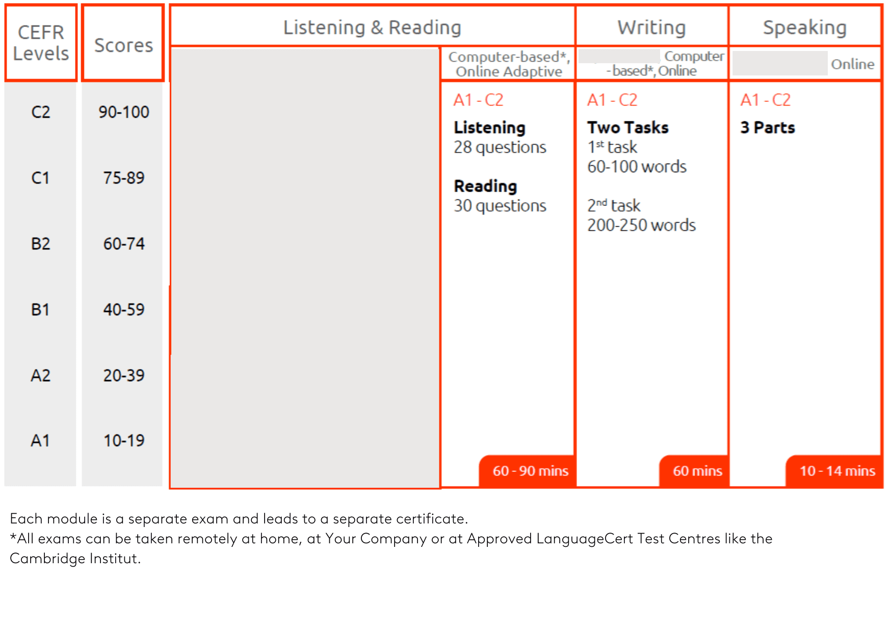 Legen Sie diese Prüfung jederzeit online von Ihrem eigenen Laptop aus ab - entweder in Form eines Volltests (alle vier Komponenten) oder eines Einzeltests (Module Listening, Reading & Writing zusammen oder das Modul Speaking). Die Prüfungskomponenten sind: